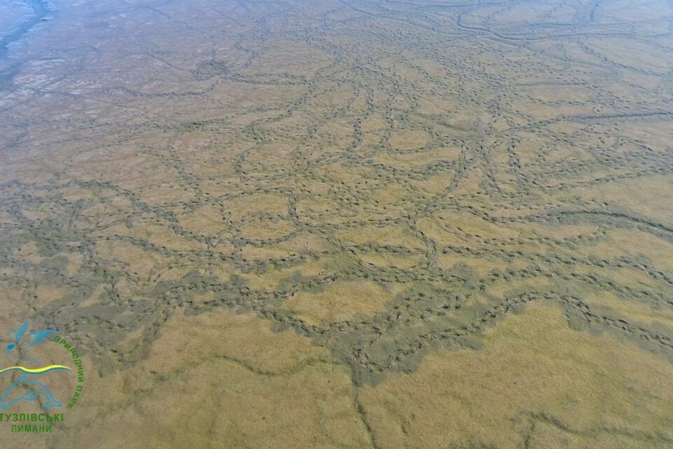 Іван Русєв додав до допису фото сьогодення лиману Малий Сасик. На них – сліди річкової видри, яка завжди тут мешкала і вільно ловила собі рибу. Зараз вона повинна долати немалі відстані, аби прогодуватися. Тут також є багато слідів птахів, особливо куликів, які зараз мігрують через Національний природний парк «Тузлівські лимани».