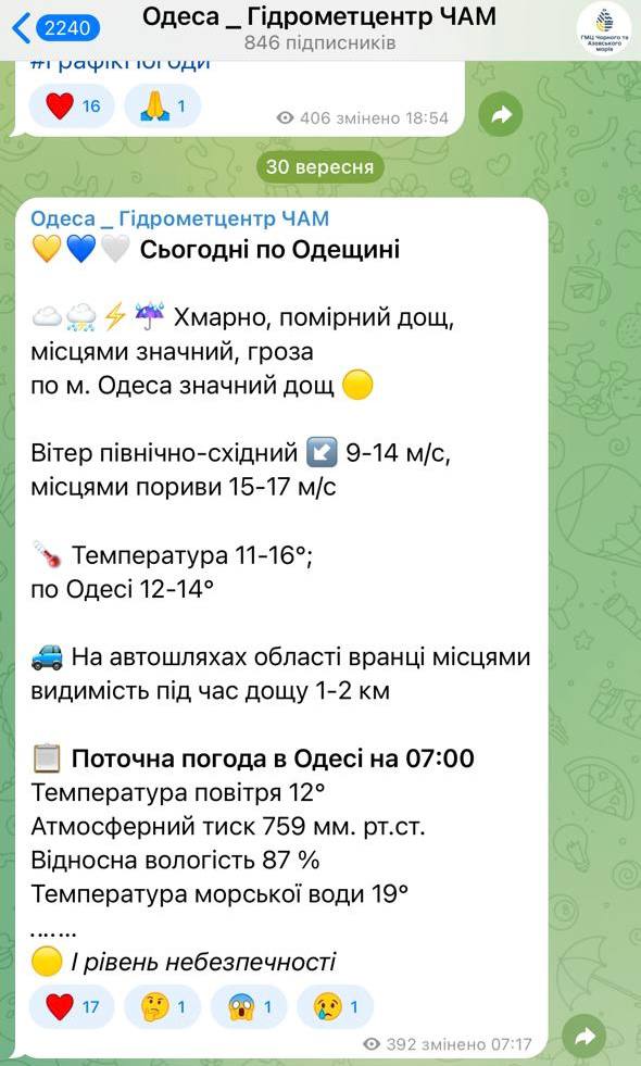 І тут ми бачимо дивну картину. 30 вересня, ранок. На 8:00 – жовтий рівень небезпеки. Буквально це означає: так, можуть бути проблеми з дорогами чи комунальними службами, але прямої загрози життю начебто немає. Тобто, підприємства працюють, діти можуть перебувати у школах та дитсадках, не зупиняється громадський транспорт та ін.