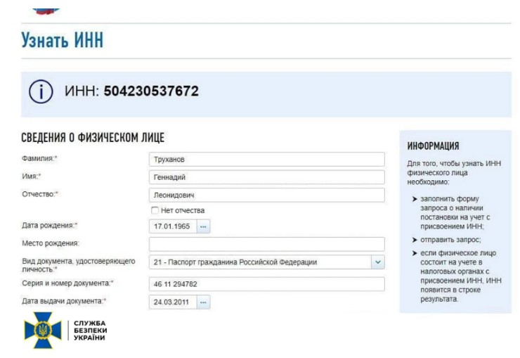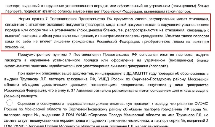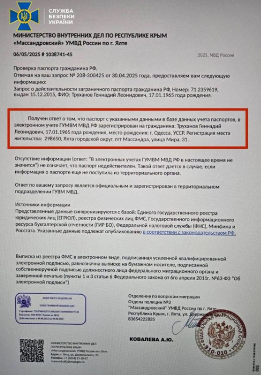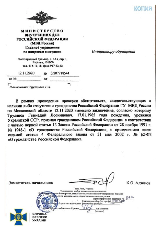 Що стосується внутрішнього паспорта Росії, то за наявною СБУ інформацією, у 2017 році представники Труханова звернулися із заявою до російських уповноважених органів та у підсумку суд у Московській області скасував чинність його внутрішнього паспорта.