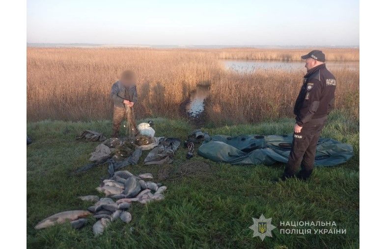 Чоловіка виявили на гумовому човні разом із сітками та уловом, без дозвільних документів. У нього вилучили 42 одиниці риби (сазанів та карасів), які віддали на тимчасове зберігання до спеціалізованого підприємства, а також плавзасіб, забрідний рибальський костюм і чотири ліскові сітки загальною довжиною 400 метрів.