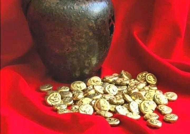 За легендою, восьмеро місцевих жителів добували глину, коли знайшли в землі бронзовий глечик, набитий золотими монетами (за деякими повідомленнями, це сталося ще у 1963 році. Загальну кількість монет (ніби їх було 98) не можна було поділити однаково на вісім – хтось отримав менше, хтось більше. Тоді ображена особа або його родичі повідомили про знахідку компетентним органам.