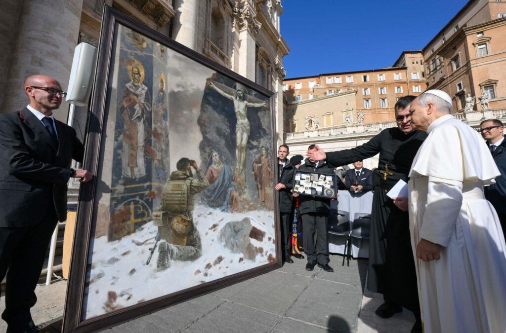 Під час вручення подарунка, за словами священника о. Павла, Святіший Отець благословив картину та через неї — всіх українських захисників.