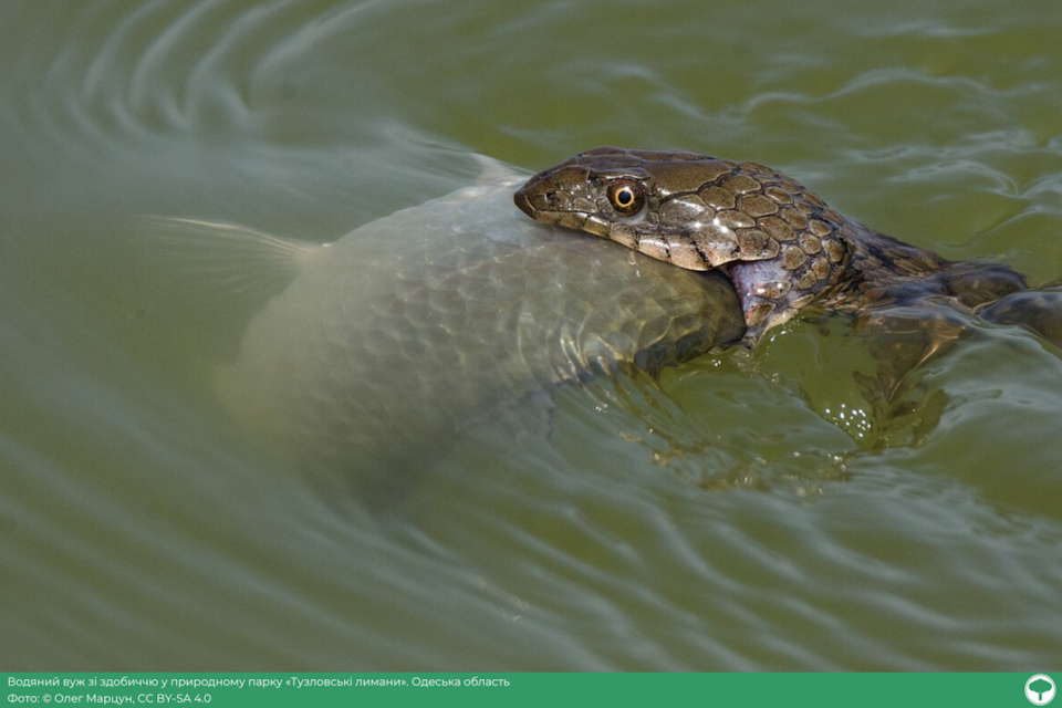 «На озері Малий Сасик, у Тузлівських лиманах, я натрапив на справжній «вужачий шведський стіл». Десятки водяних вужів то тут, то там випливали з уловом — хто з бичком, хто з камбалою, а хто й з карасиком, як із трофеєм року. І саме один такий герой спіймав досить великого карася. Змій подиву гідний: тримає здобич, як чемпіон, але чи проковтнув він того гіганта — загадка. Пірнув у воду й більше не показався. На згадку залишив лиш цю світлину», — розповів автор фото Олег Марцун.