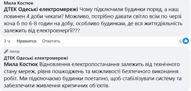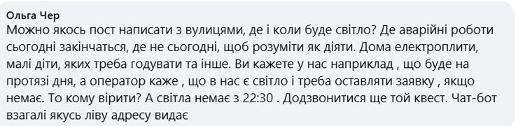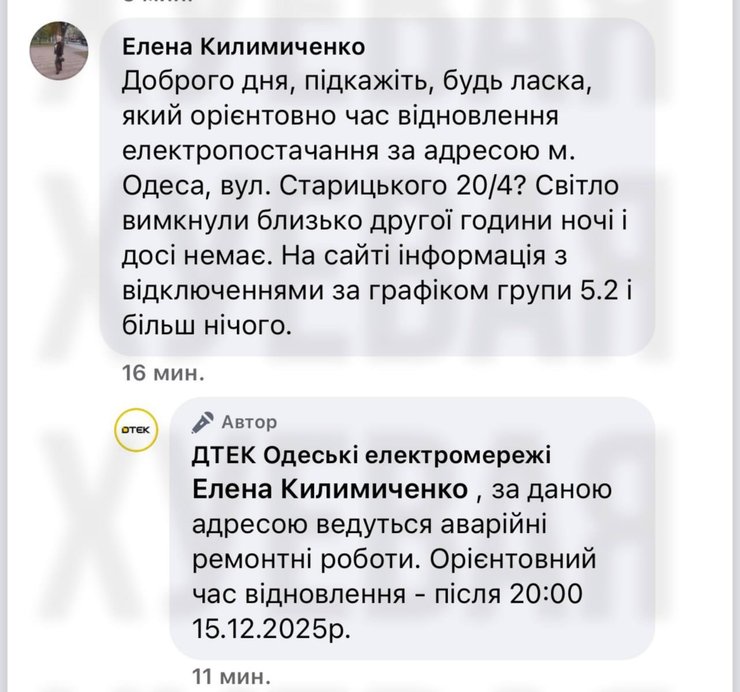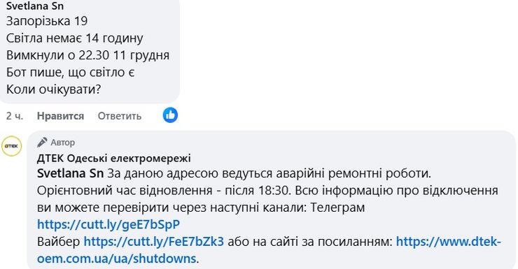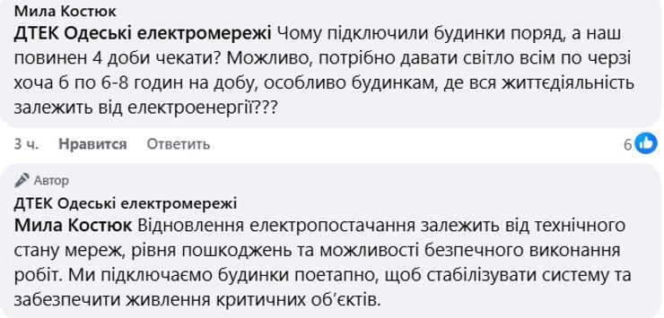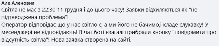 "Чому підключили будинки поруч, а наш має 4 доби чекати? Можливо, необхідно давати світло всім по черзі хоча б по 6-8 годин на день, особливо будинкам, де вся життєдіяльність залежить від електроенергії?", "Можна якось пост написати з вулицями, де й коли буде світло? Де аварійні роботи сьогодні закінчаться, де не сьогодні, щоб розуміти, як діяти. Вдома електроплити, маленькі діти, яких потрібно годувати та інше... А світла немає з 22:30. Додзвониться — ще той квест", "Світла немає з 22:30 11 грудня і донині! Заявки відхиляються як "не підтверджена проблема"!" — скаржаться одесити.