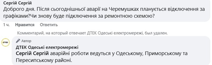 У коментарях на сторінці ДТЕК Одеські електромережі абоненти пишуть про те, що світла немає цілодобово.
