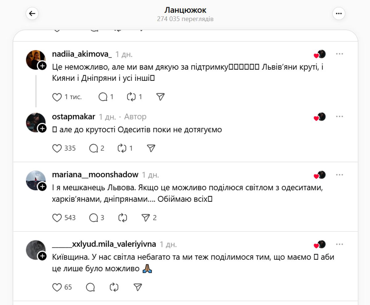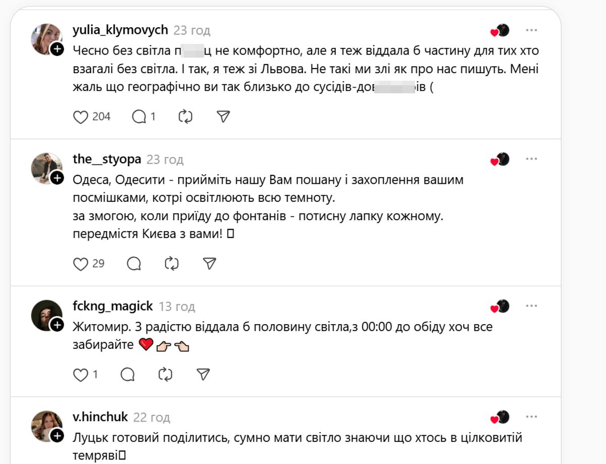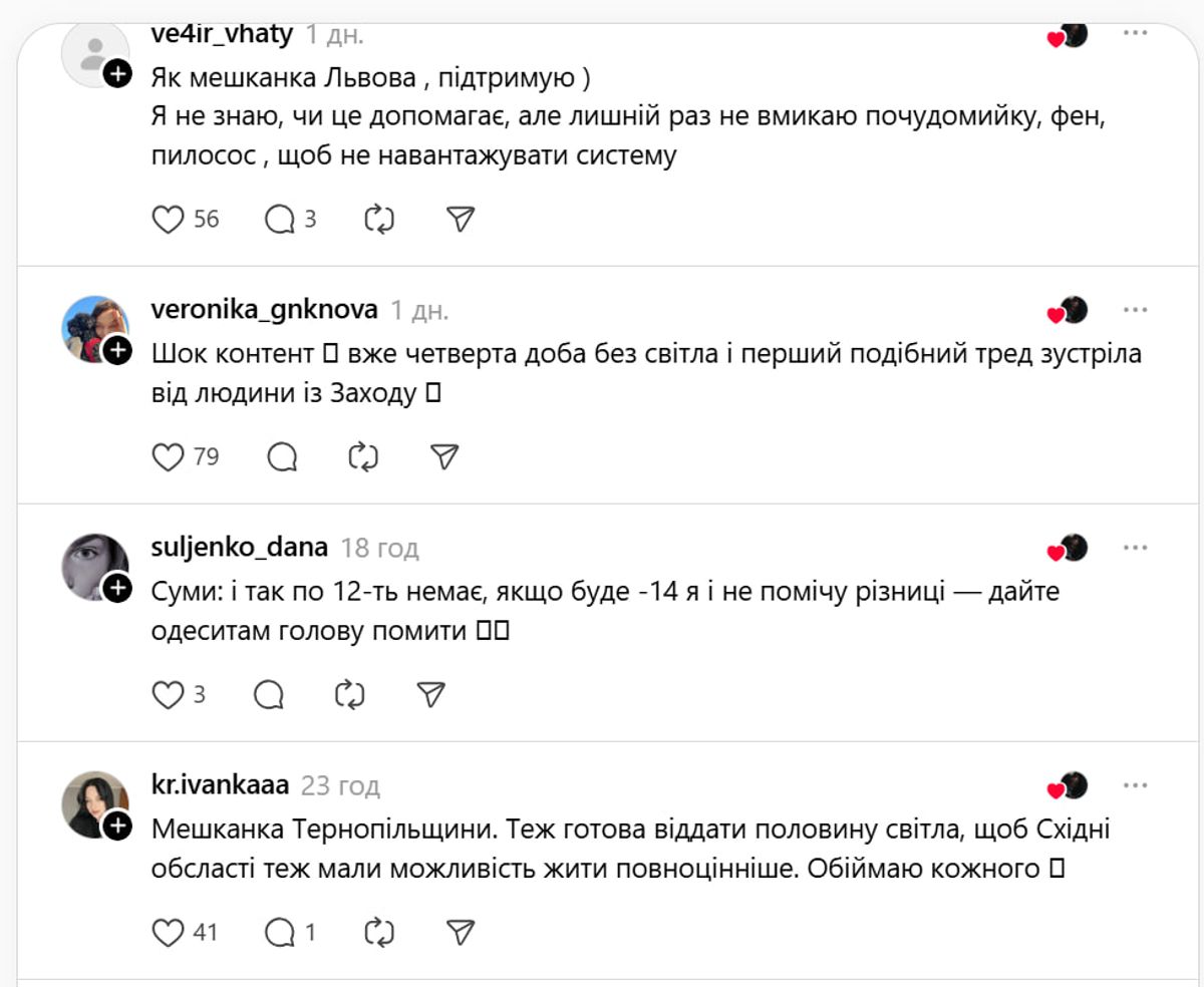 Українці знову продемонстрували, що навіть у найтемніші часи вони несуть світло в собі. І готові поділитися ним з іншими – навіть з іншою областю. В соцмережі Threads жителі різних регіонів, від Львова до Харкова, від Чернігова до Херсона, пропонують передати світло в Одесу.