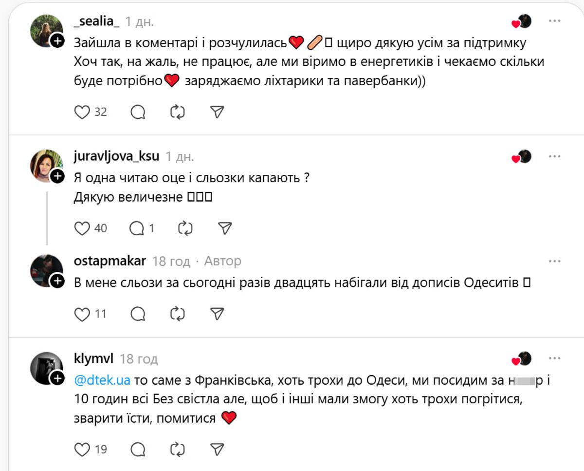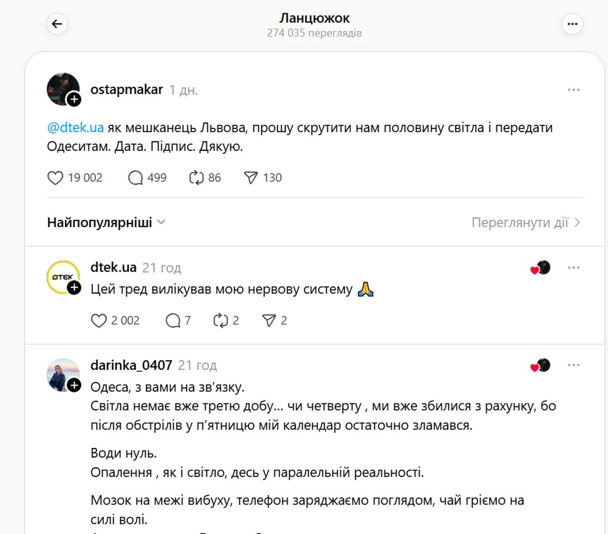 Користувач Остап Макар започаткував цілий тред світла – в усіх сенсах. Він звернувся до ДТЕК і закликав передати світло в Одесу, яка дуже страждає від російських атак. Деяких споживачів почали заживлювати, але дехто четвертий день у блекауті.