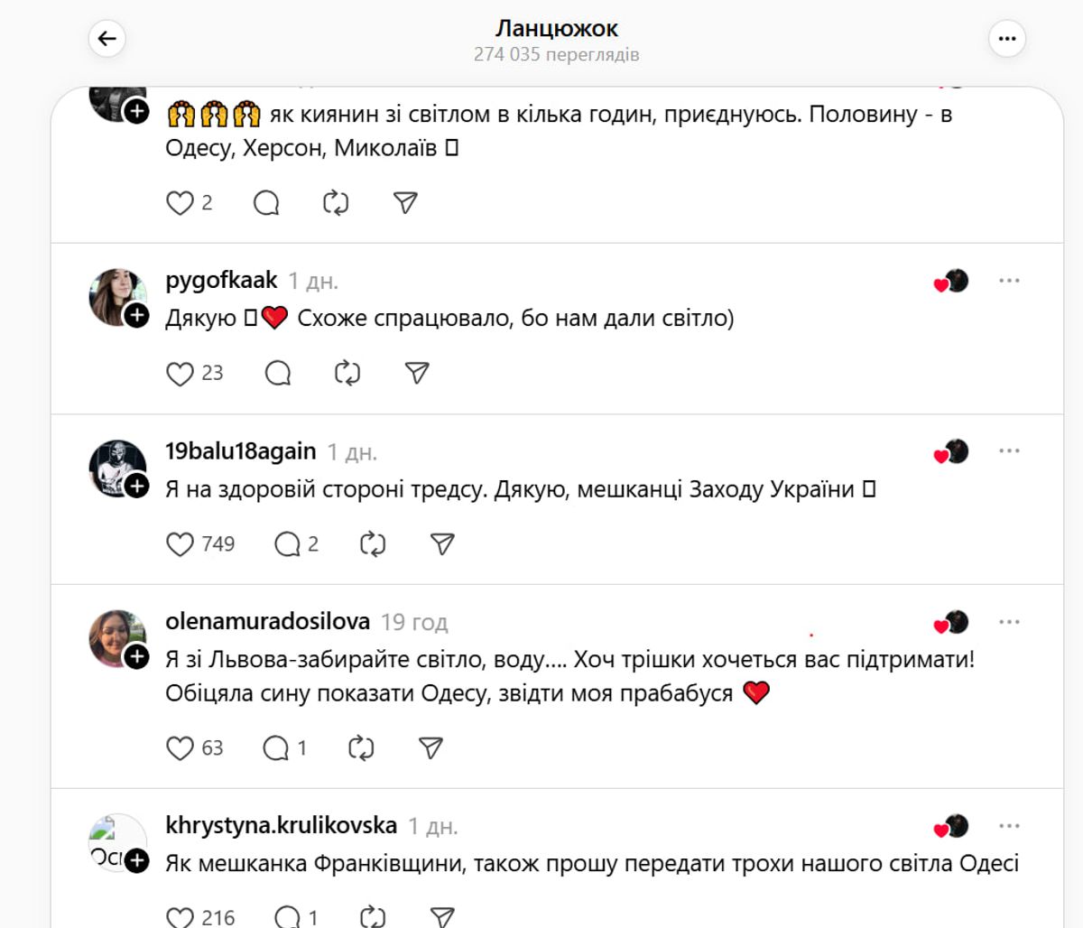Цей допис отримав 274 тисячі переглядів, 19 тисяч лайків і майже 500 коментарів. Користувачі тредсу започаткували цілий флешмоб, теж пропонуючи поділитися світлом з Одесою.