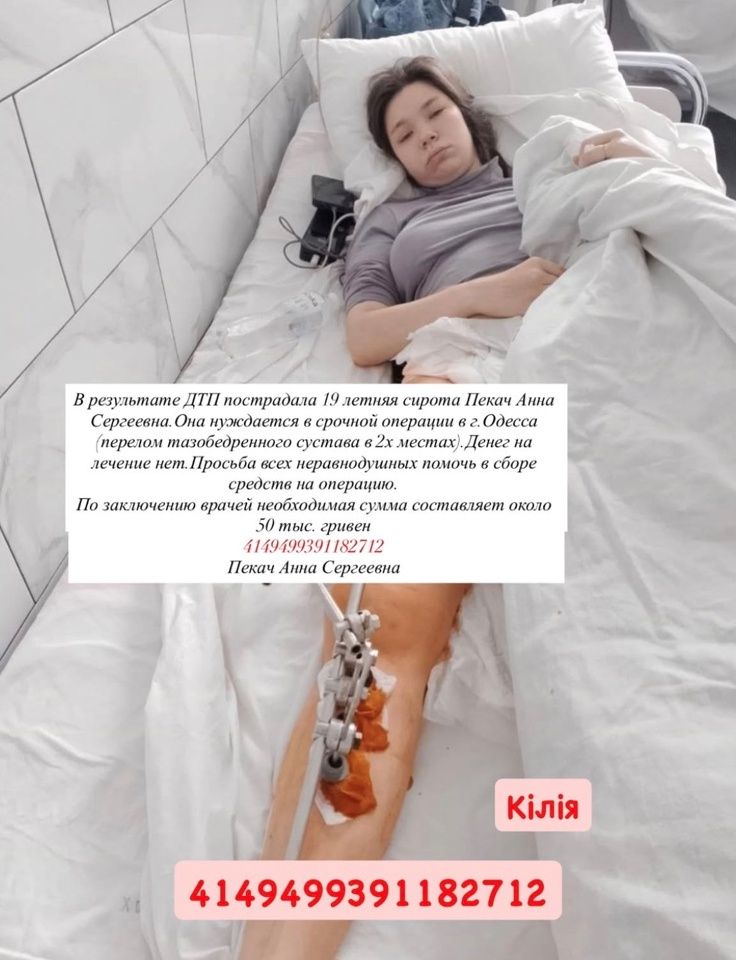 “У результаті ДТП постраждала 19-річна сирота Пекач Анна Сергіївна. Вона потребує термінову операцію у місті Одеса (перелом кульшового суглоба у двоох місцях). Грошей на лікування немає. Прохання всіх небайдужих допомогти у збиранні коштів на операцію.