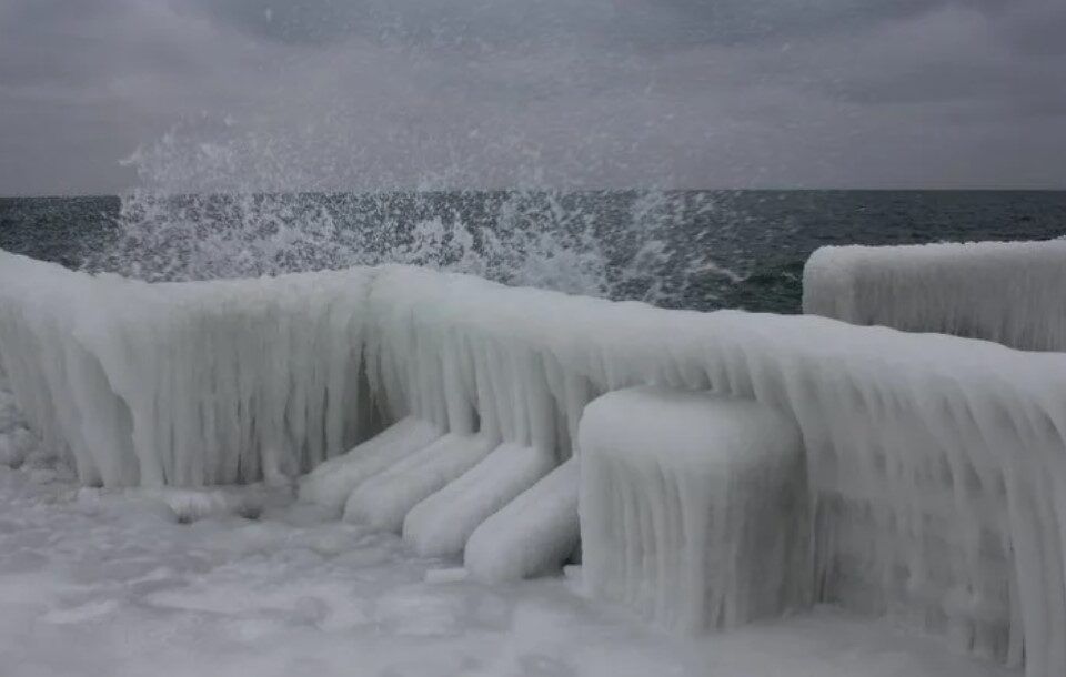 Берегова лінія Одеси вже кілька днів нагадує кадри з арктичних широт. Крижані нарости на камінні та пірсах створили сюрреалістичні пейзажі, нетипові для півдня України.