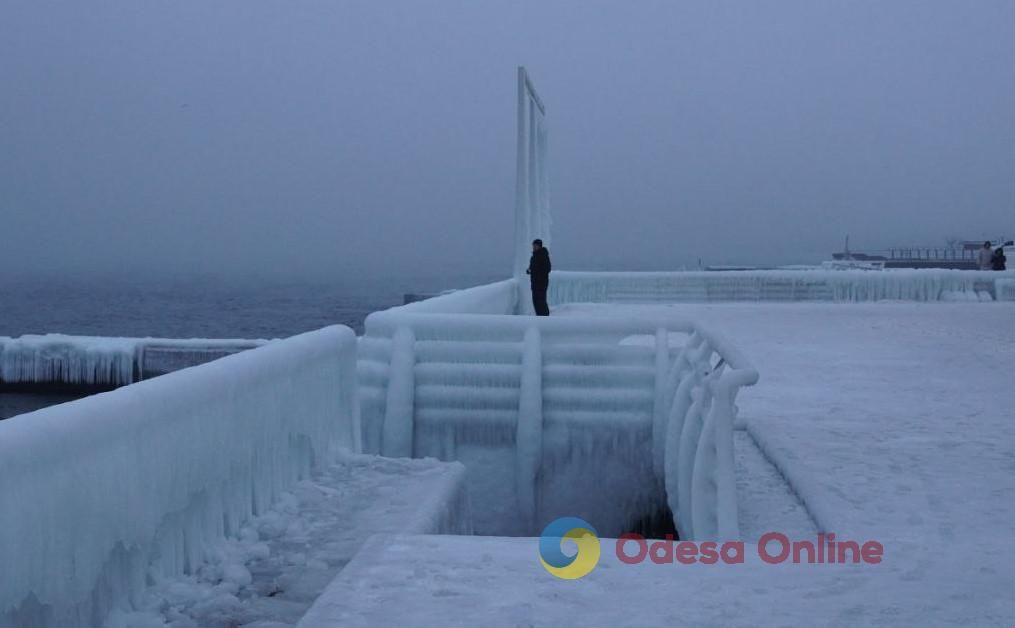 Кореспондентка Odesa Online зафільмувала, як химерні крижані скульптури майже повністю «закували» залізні поручні та бетонні конструкції набережної.