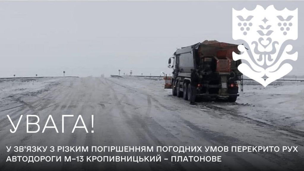 Через різке погіршення погоди — дощ за мінусової температури та сильну ожеледицю - з 18:30 6 лютого повністю перекрито рух для всіх видів транспорту на автодорозі М—13 Кропивницький — Платонове (на Кишинів) по всій її протяжності. Ділянка: км 157+052 – км 254+068.