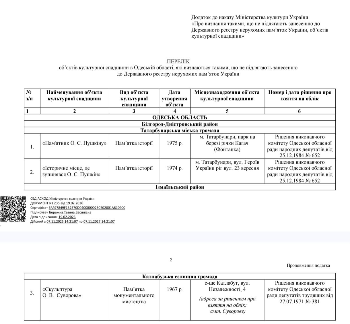 Міністерство культури України внесло до переліку об'єктів, які не підлягають занесенню до Державного реєстру нерухомих пам'яток України пам'ятник поету Олександру Пушкіну в місті Татарбунари Одеської області.