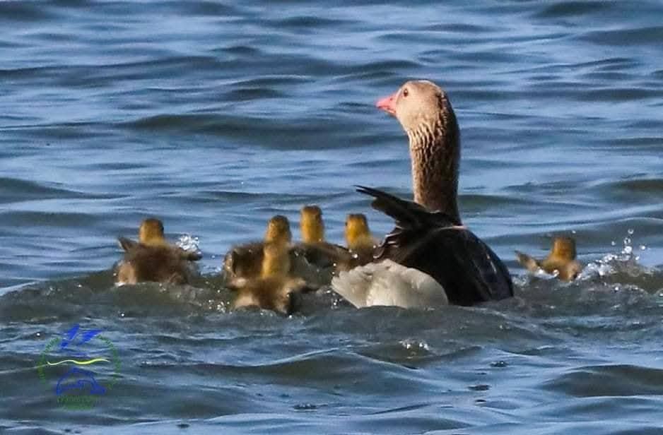 Фото: з допису Івана Русєва — пара сірих гусей із малечею в НПП «Тузлівські лимани»