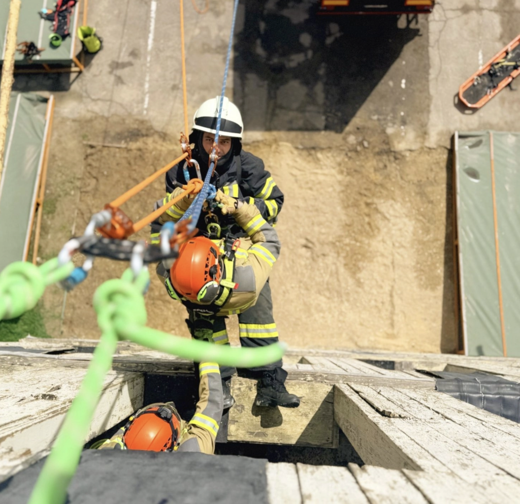 Заняття проводять на базі спеціальної навчальної башти, де рятувальники відпрацьовують різні складні сценарії — від безпечного пересування на висоті до швидкісної евакуації постраждалих із небезпечних зон.