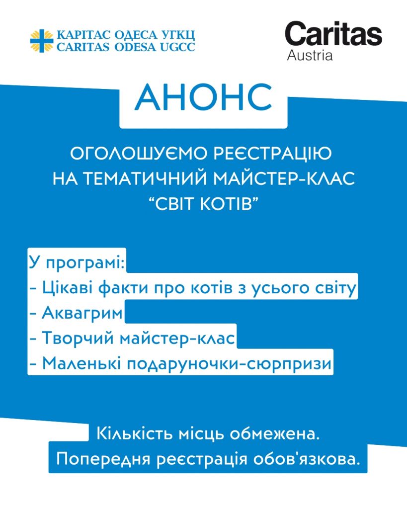 Запрошуємо дітей на тематичне заняття та творчий майстер-клас “Світ котів”.