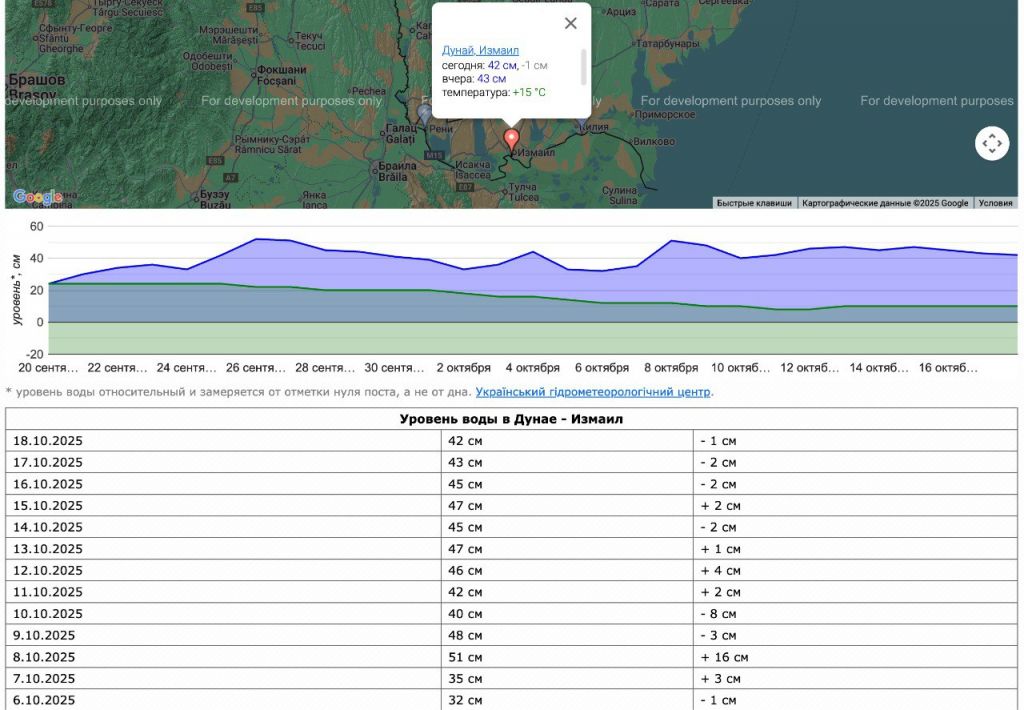 Після інтенсивних дощів, які пройшли в регіоні на початку жовтня, рівень води в Дунаї біля Ізмаїла поступово знизився та станом на 18 жовтня становить 42 см. Це на 1 см менше, ніж учора, свідчать дані Українського гідрометеорологічного центру.