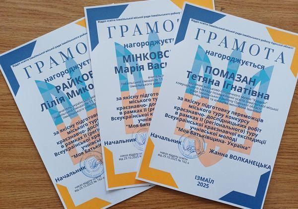 Всі учасники конкурсу, переможці та вчителі, які здійснювали наукове керівництво, нагороджені грамотами відділу освіти Ізмаїльської міської ради Ізмаїльського району Одеської області.