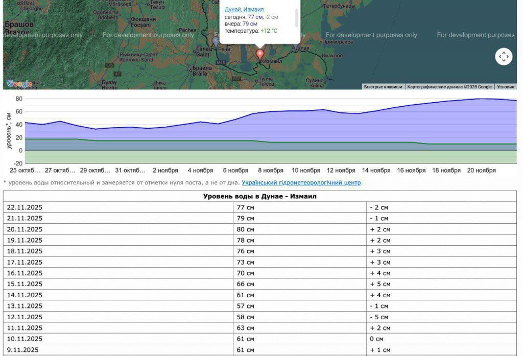 За останній тиждень рівень води в Дунаї в Ізмаїлі зріс із 70 см до 77 см. Найбільші підйоми спостерігалися 16–18 листопада, коли вода піднімалася на +3…+4 см щодня. Після цього рівень стабілізувався та залишився в межах 76–80 см.
