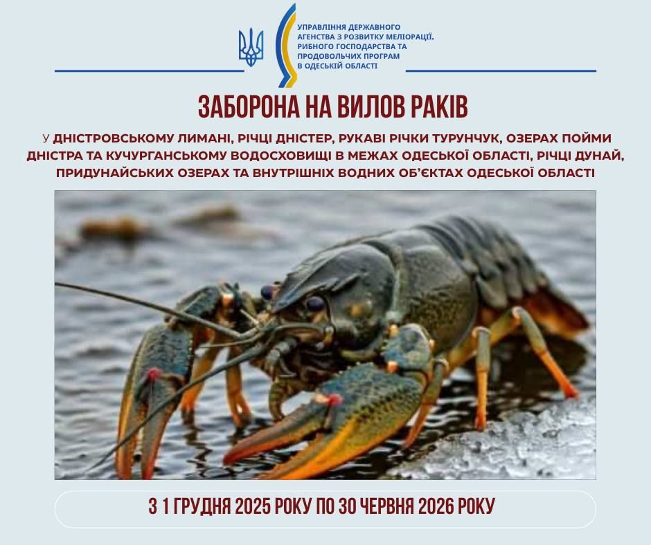 з 1 грудня 2025 року встановлюється заборона на вилов раків у внутрішніх водних об’єктах Одеської області, річці Дунай та Придунайських озерах
