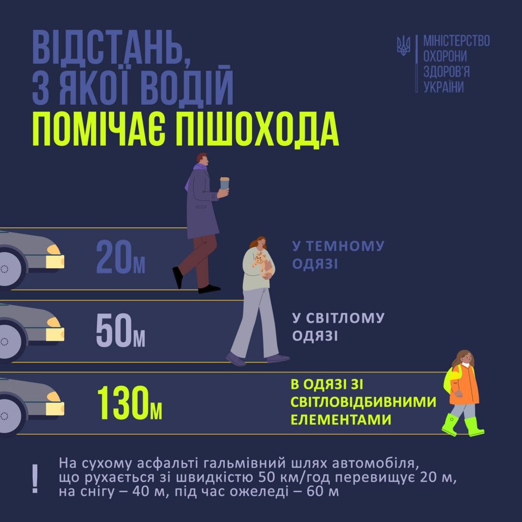 обов’язково використовувати світловідбивні елементи — флікери (вони збільшують видимість пішохода в кілька разів); вішати їх на сумки, рюкзаки, одяг (бажано – на висоті стегна);