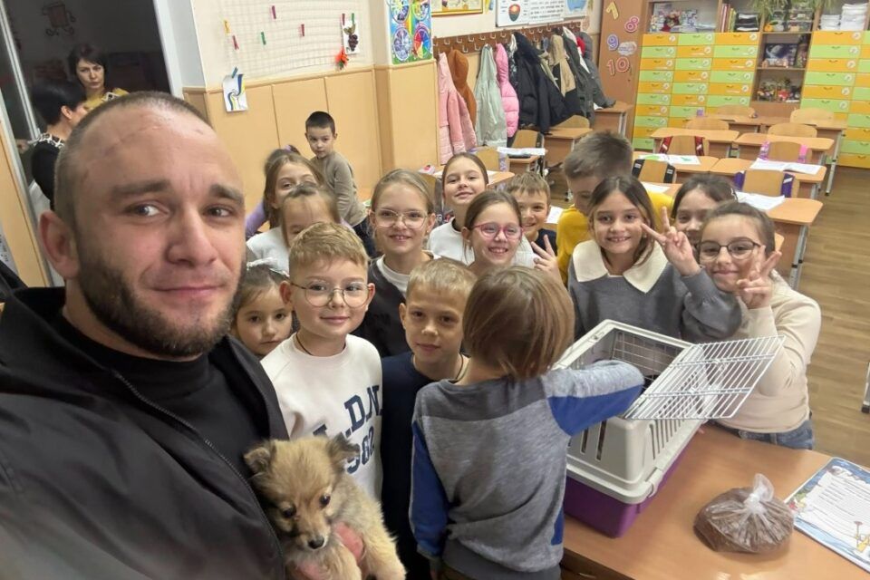 До ліцею волонтер прийшов не сам. Компанію йому склали однооке кошеня, яке вже пережило операцію, та цуценя, нещодавно підібране на трасі. Разом зі своїми підопічними Роман провів зустрічі з учнями чотирьох класів.