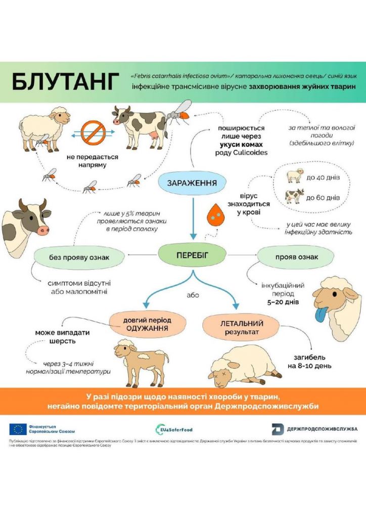 Блутанг (катаральна лихоманка овець/ синій язик) – інфекційне трансмісивне вірусне захворювання жуйних тварин (вівці, кози, велика рогата худоба, білохвості олені, буйволи, антилопи, лосі та інші жуйні). Для людини небезпеку не становить. Зараження поширюється лише через укуси комах роду Culicoides, вірус довго знаходиться у крові. Перебіг хвороби можливий з проявом ознак (інкубаційний період 5-20 днів) або без них (симптоми відсутні або малопомітні).