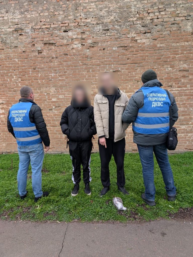 Під час огляду згортка за участю співробітників поліції було виявлено два пакунки з речовиною зеленого кольору з характерним запахом канабісу, пластикову пляшку з рідиною з ознаками алкоголю та три мобільні телефони.