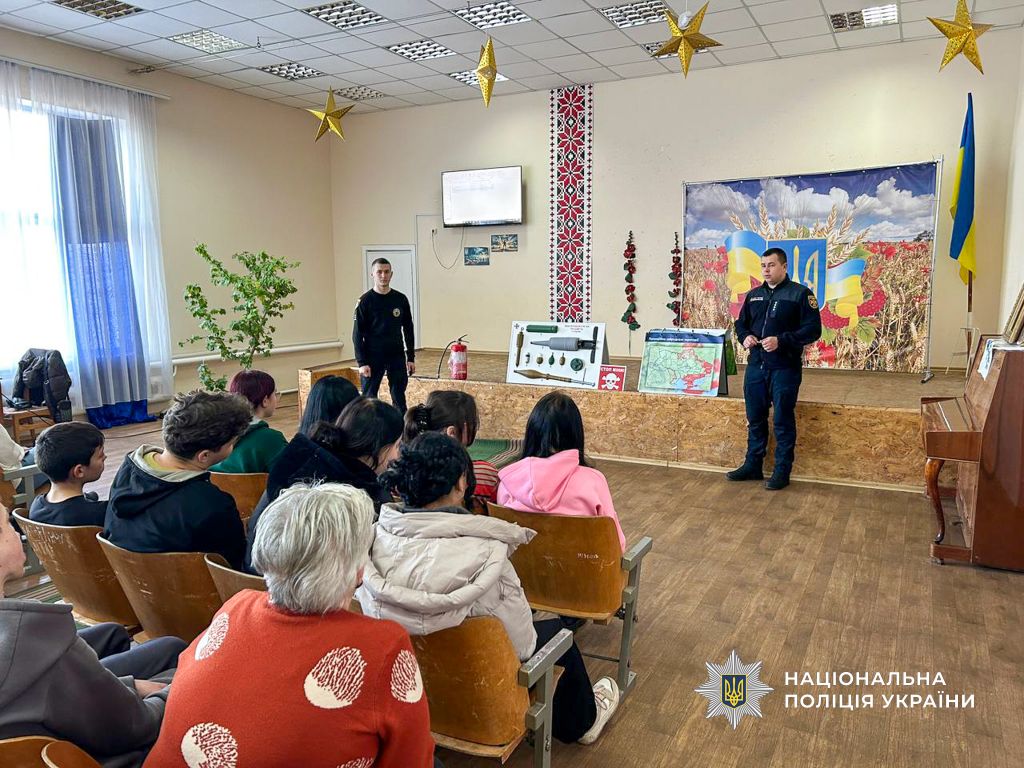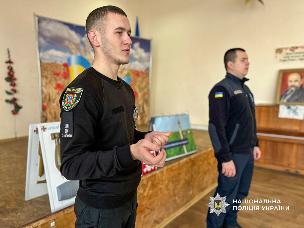 Разом зі співробітниками з ДСНС поліцейські торкнулися питань мінної безпеки. Показали макети вибухонебезпечних пристроїв і наголосили, що у разі їх виявлення потрібно відійти на безпечну відстань та негайно повідомити за номерами 101 або 102.