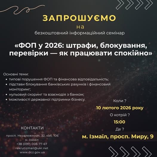 Ізмаїльська філія Одеського обласного центру зайнятості запрошує фізичних осіб — підприємців та представників малого бізнесу на безкоштовний семінар: «ФОП у 2026: штрафи, блокування, перевірки — як працювати спокійно».