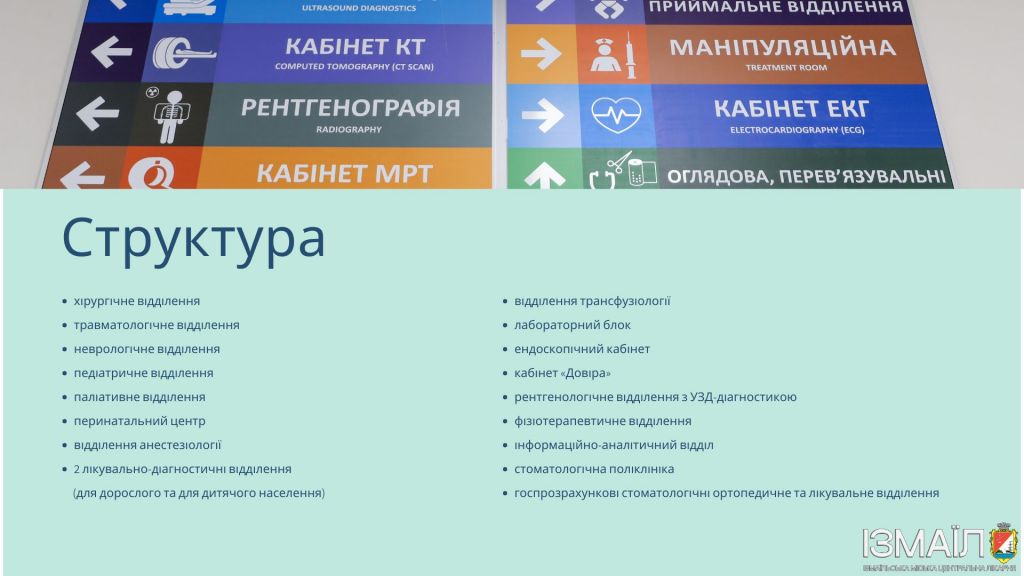 Ізмаїльська міська центральна лікарня — це сучасний медичний заклад із широким спектром послуг Cегодня в 17:18Общество До структури лікарні входять: хірургічне відділення, травматологічне відділення, неврологічне відділення, педіатричне відділення, паліативне відділення, перинатальний центр, відділення анестезіології, два лікувально-діагностичних відділення (для дорослих і дітей), відділення трансфузіології, потужний лабораторний блок (клініко-діагностична, бактеріологічна, гістологічна лабораторії), ендоскопічний кабінет, кабінет «Довіра», рентгенологічне відділення з УЗД-діагностикою, фізіотерапевтичне відділення, інформаційно-аналітичний відділ, стоматологічна поліклініка та госпрозрахункові стоматологічні відділення. Щодня тут працюють фахівці, які забезпечують якісну медичну допомогу мешканцям громади — від діагностики до лікування та реабілітації. Дбаємо про ваше здоров’я разом! Джерело: Ізмаїльська міська центральна лікарня Загрузка...