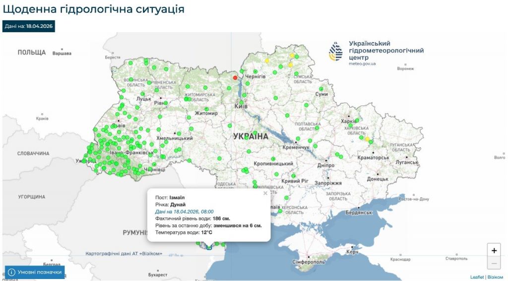 Станом на 08:00 18 квітня 2026 року на гідропості Ізмаїл рівень води в Дунаї становить 186 см.