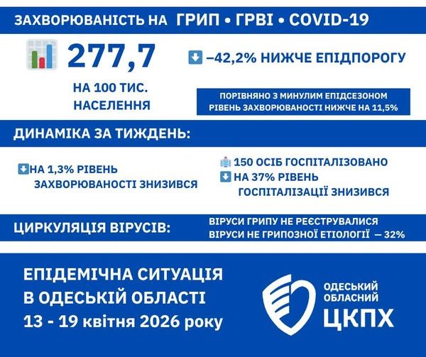 За даними епіднагляду, загальний показник становить 277,7 випадків на 100 тисяч населення, що на 42,2% нижче епідемічного порогу. У порівнянні з попереднім тижнем рівень захворюваності загалом знизився на 1,3%.