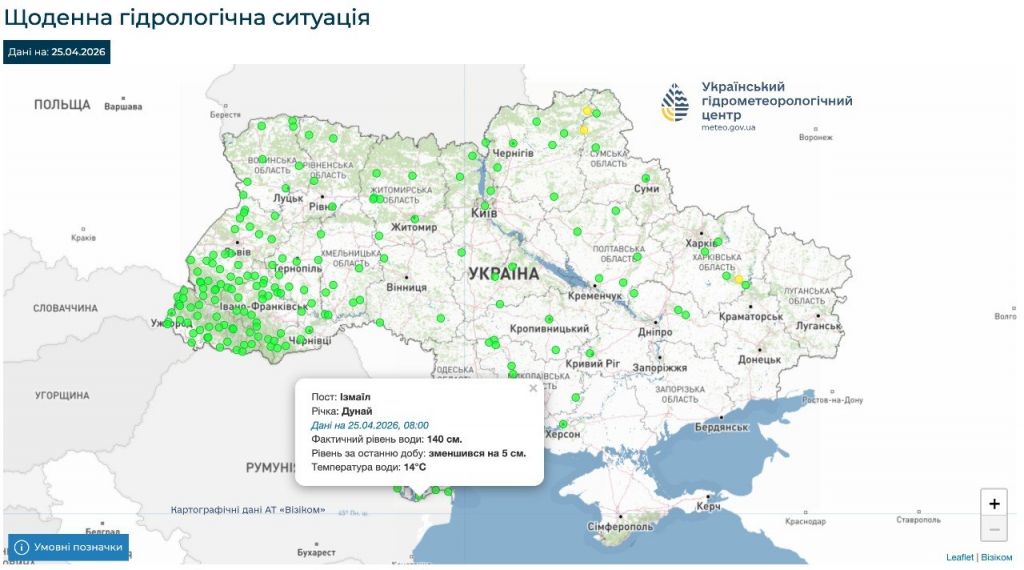 Станом на 08:00 25 квітня 2026 року рівень води в Дунаї на посту Ізмаїл становить 140 см.