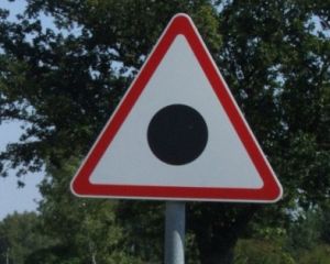На українських дорогах почали масово з'являтися незвичні дорожні знаки - білий трикутник у червоній рамці з чорною крапкою всередині.