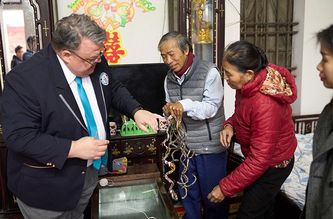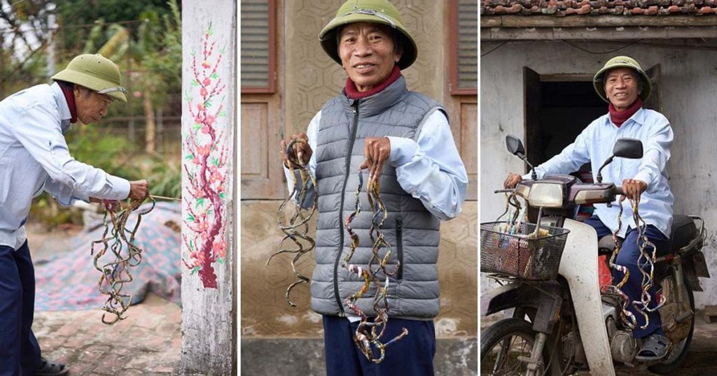 Лю також похизувався, він мчить вулицями провінції Намджінь на своєму мопеді, і показав, як він маневрує в сорочці, обережно просовуючи руки в рукави за допомогою своєї дружини, Тхі Туан, яка також допомагає йому в роботі над картинами.