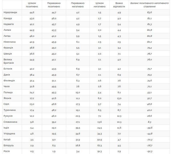 Українці найбільш позитивно ставляться до таких країн, як Нідерланди, Канада, Норвегія, Латвія, Литва, Німеччина, Франція, Швеція, Велика Британія та Естонія. На цьому наголошують результати дослідження, проведеного Центром Разумкова.