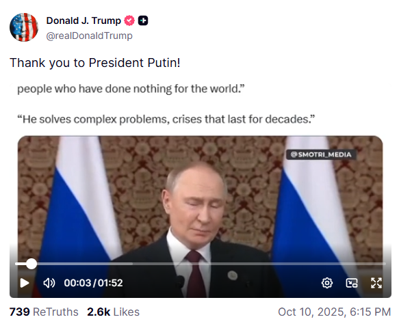 Президент США Дональд Трамп подякував російському диктатору Володимиру Путіну після його слів про зусилля американського лідера щодо розв'язання проблем. Про це повідомляє посиланням на допис Трампа у соцмережі Truth Social.