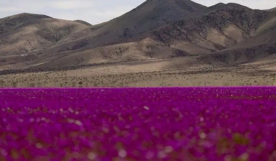 У національному парку Льянос-де-Чальє в Чилі сталося рідкісне природне явище — пустеля Атакама, одна з найсухіших у світі, на короткий час перетворилася на яскравий килим із фуксійних польових квітів.