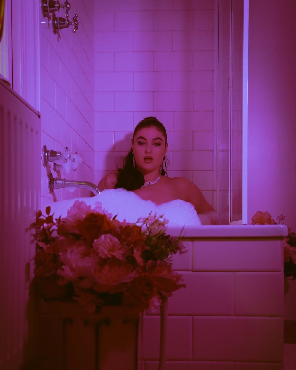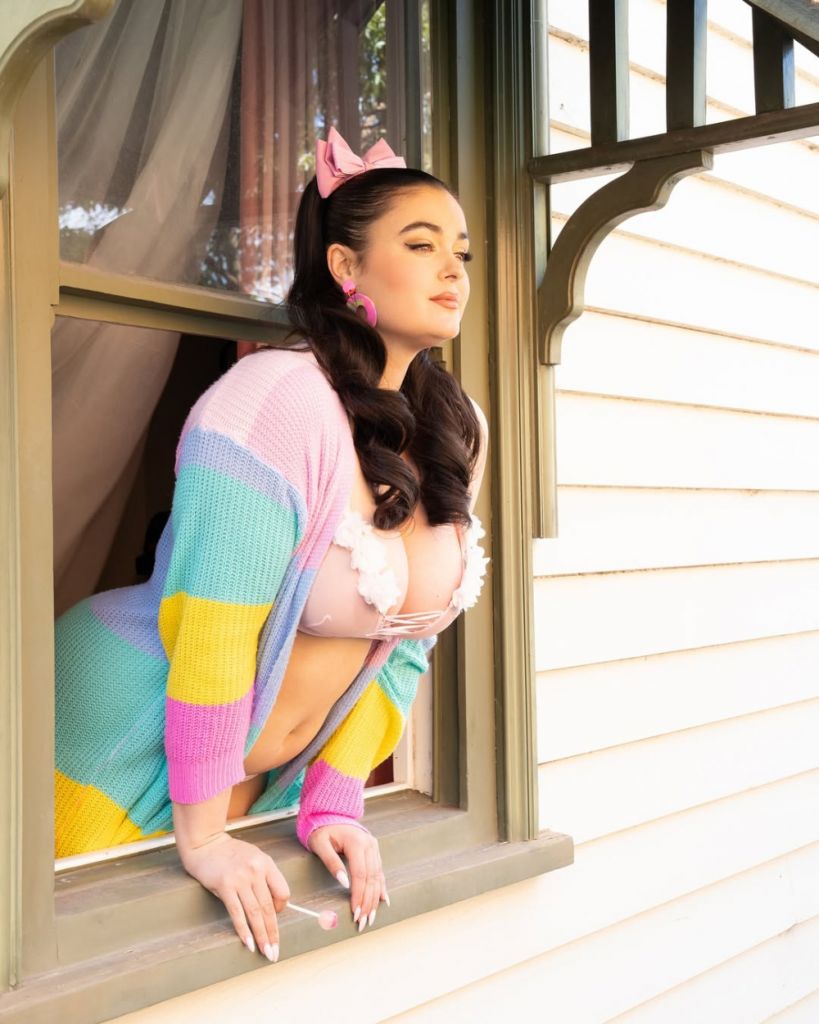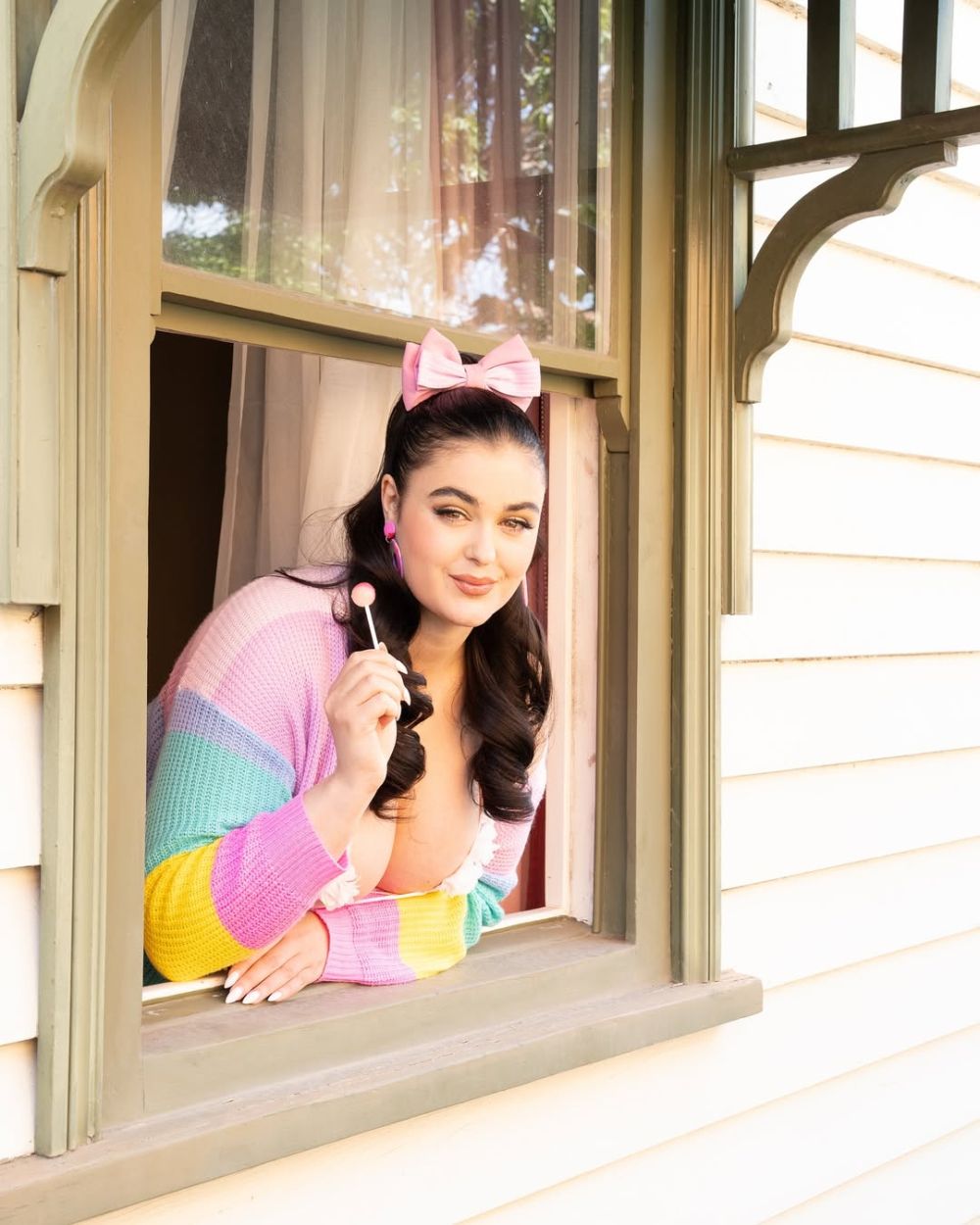 Перед камерою постала у ніжно рожевому комплекті білизни та кардигані у пастельних кольорах. Аутфіт доповнила ніжним макіяжем, зібраним у хвіст волоссям, бантом і масивними сережками.