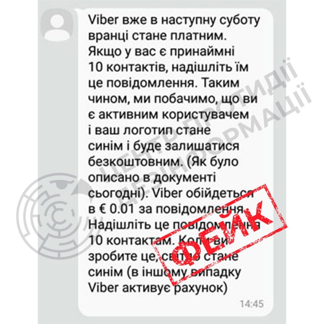 «Користувачі месенджера отримують повідомлення, що «вже наступної суботи Viber стане платним». У тексті закликають «переслати це повідомлення 10 контактам, щоб месенджер залишився безкоштовним», і додають, після цього «логотип стане синім». Це старий фейк, який циркулює у мережі щонайменше з 2018 року. Його текст неодноразово «оживав» у нових хвилях розсилок. У повідомленні немає жодних конкретних дат, офіційного джерела чи підтвердження від компанії Viber. Фрази, як «наступної суботи» без вказування дати, присутні у повідомленні для імітації актуальності», - йдеться в повідомленні.