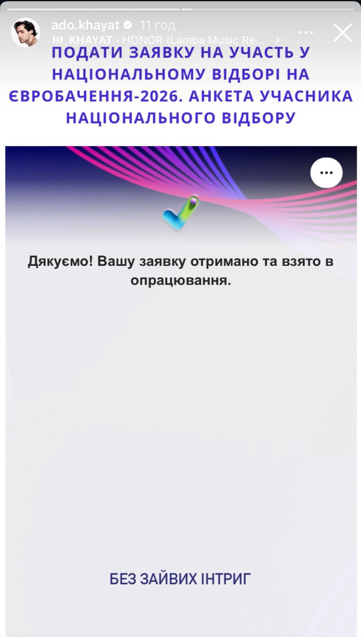 Співак потішив шанувальників приємною новиною в Instagram. Так, у сториз він опублікував скриншот, де видніється екран з написом про підтвердження подачі анкети на участь у нацвідборі. Водночас KHAYAT додав, що надіслав на розгляд одразу дві композиції. Як відомо, процесом відбору треків цього року займається Джамала. Саме вона у ролі продюсерки обиратиме пісні, які зможуть потрапити до списку нацвідбору.