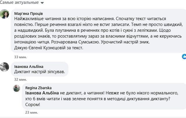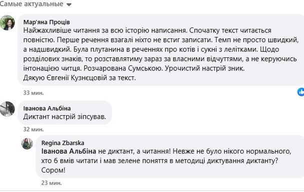 Особливо українці критикують диктування першого речення диктанту, яке, за їхніми словами, було прочитано надто швидко і написати його було вкрай важко.