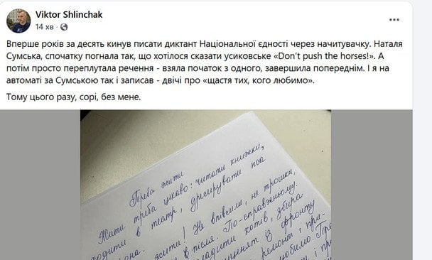 «За 26 років — це перший диктант, який звалив мене наповал. По перше, недобре прочитаний. Сам текст дурнуватий. Я не знаю, хай би краще читав текст Павло Вишебаба, який минулого року диктував. За ним хоч можна було писати одразу всі розділові знаки».