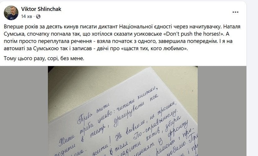 «По-перше, ніколи, ще з середньої школи, не любив колгоспів. По-друге, диктант не сприяє національній єдності, а просто так називається. Бо нація — це 100% населення країни. А диктант пише мо' 20%», — заявив він.