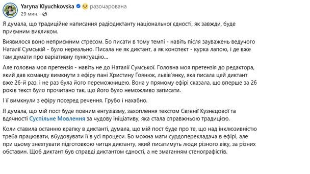 Так, багаторічна переможниця національного радіодиктанту Христина Гоянюк відкрито висловила критику щодо цьогорічного тексту. Христина Гоянюк зі Львова багато разів перемагала на національному радіодиктанті. Минулого року вона стала єдиною учасницею, яка написала диктант без жодної помилки.