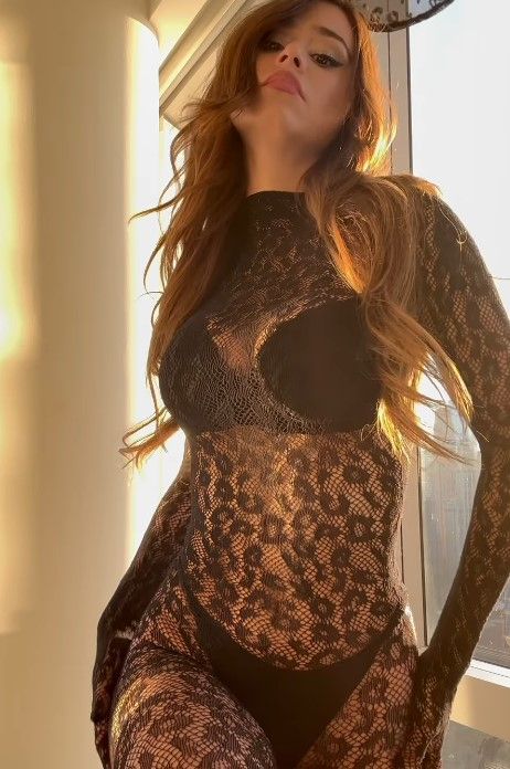 Перед камерою постала у ліфі та стрінгах чорного кольору. Також одягнула мереживний комбінезон із леопардовим принтом. Образ доповнила ледь хвилястим волоссям, обручем із вухами і легким макіяжем.