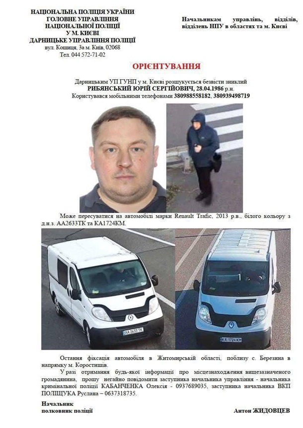 У Києві зник начальник відділення Дарницького управління поліції Юрій Рибянський і не виходить на зв'язок. Також зникли арештовані коштів, до яких він мав доступ, повідомило столичне управління Нацполіції у четвер, 6 литопада.