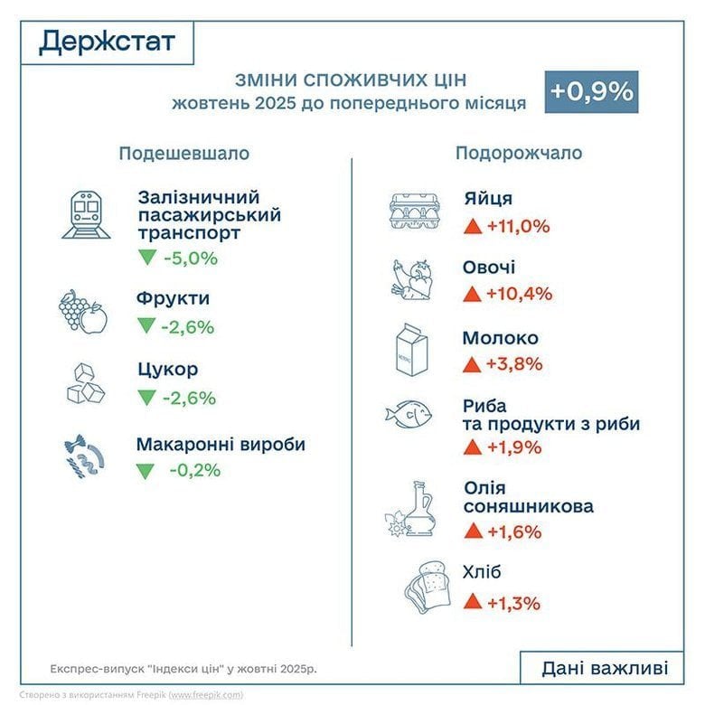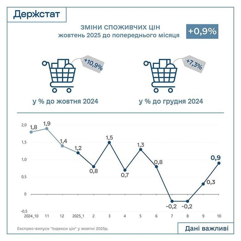 У жовтні 2025 року базова інфляція в Україні становила 0,6% (за рік — 10,2%), тоді як загальна інфляція досягла 0,9% за місяць і 10,9% у річному вимірі.