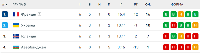 Завдяки цій перемозі збірна України (10 очок) фінішувала на другому місці у своїй групі відбору на ЧС-2026, обійшовши Ісландію (7 пунктів), яка посіла третю позицію. Франція (16 балів) з першого місця вийшла на Мундіаль. Замкнув квартет Азербайджан (1 очко).